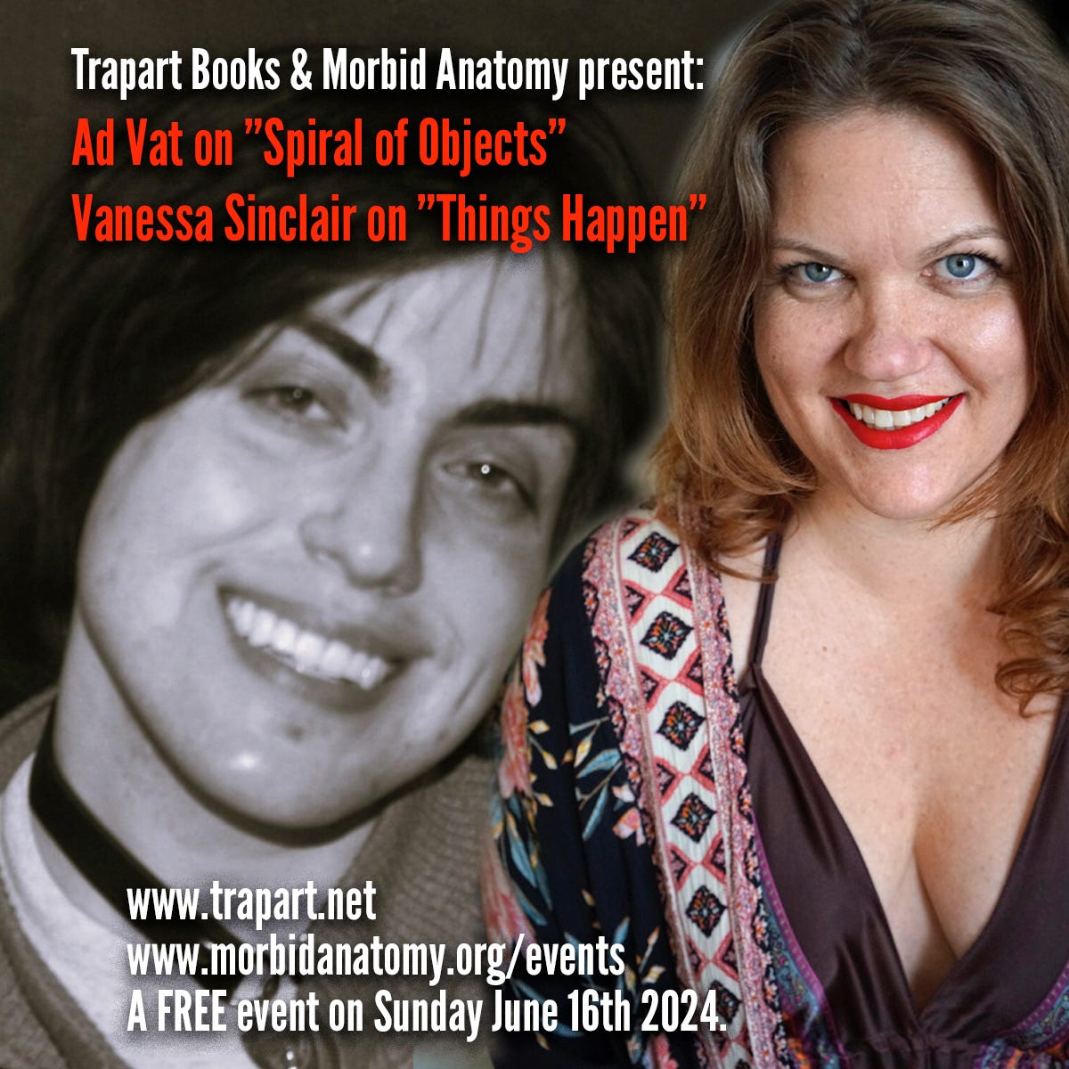 This coming Sunday, June 16, Trapart and Morbid Anatomy present a very special and FREE evening. Authors Vanessa Sinclair and Ad Vat will talk about their books Things Happen and Spiral of Objects, respectively. There will also be time for a Q & A.