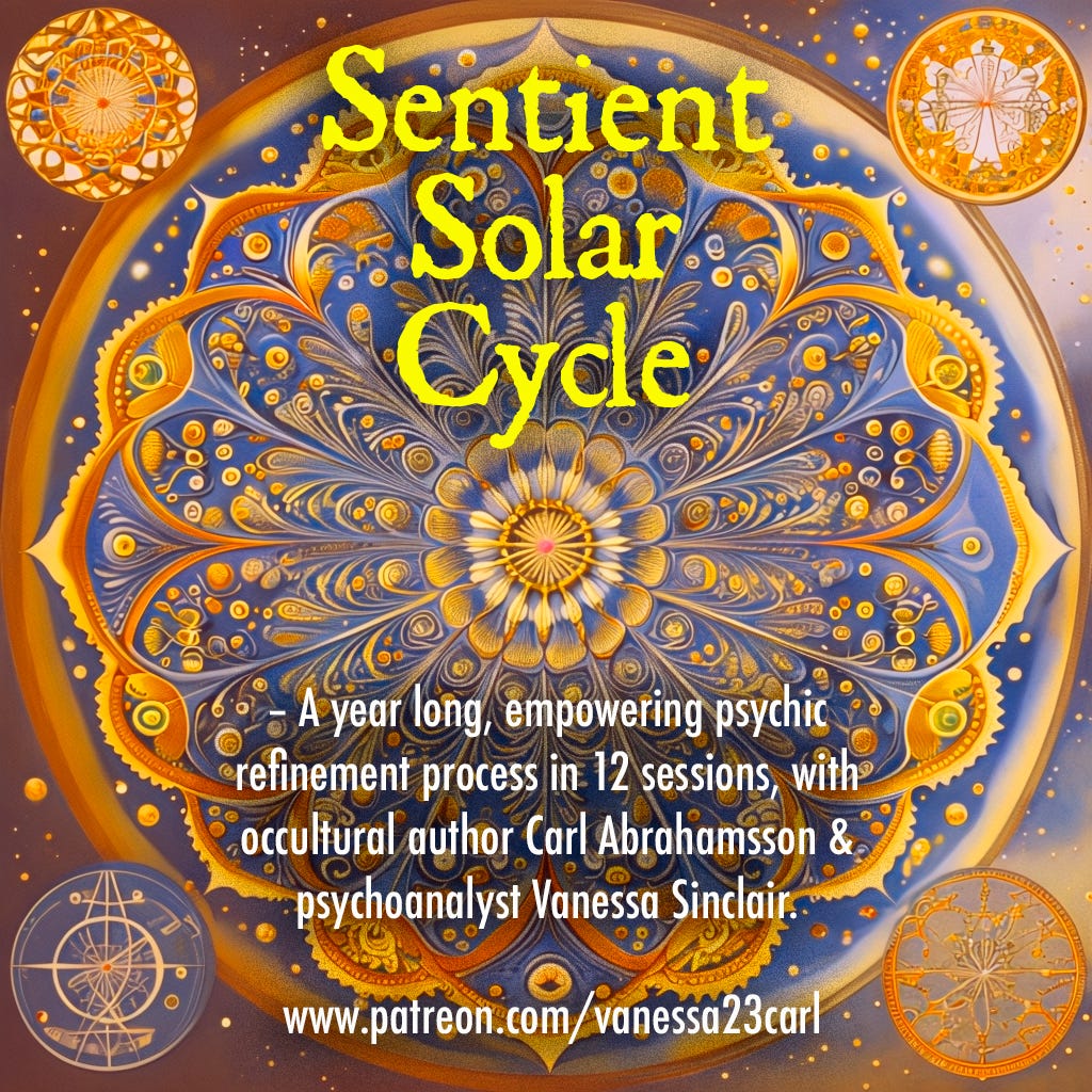 Introducing: The Sentient Solar Cycle, with author Carl Abrahamsson and psychoanalyst Vanessa Sinclair. Join them for a year long empowering psychic refinement process, with monthly meetings via Zoom. Each 23rd of the month, Carl & Vanessa will shine the light on what’s ahead in the coming month, using astrological concepts, oracular pointers, (twenty)third mind dialogs, guided meditations, and more. After each session there will also be time for Q & A and discussions.